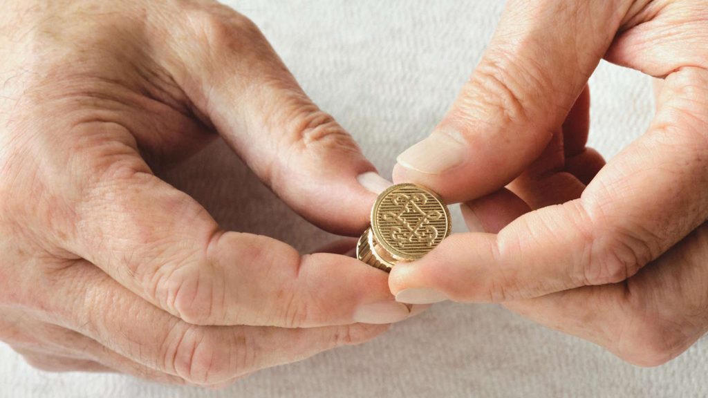 - Cono con diamantes en forma de sello, con el doble “L” de Luis XIV; puede usarse para lacrar correspondencia.