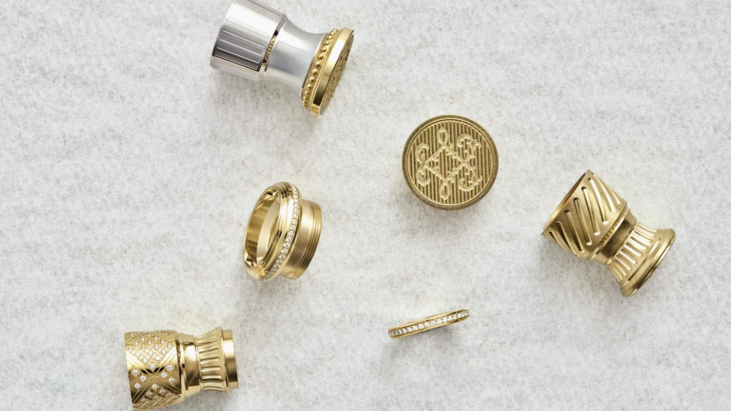 - Finas tiras de oro con diamantes que enmarcan las incrustaciones; anillos de diamantes en capuchón y cono.
