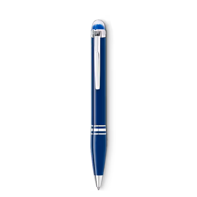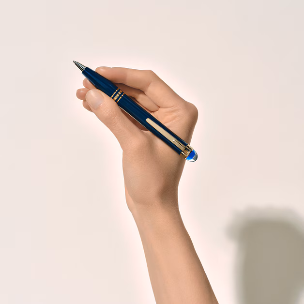 Resina preciosa azul en cuerpo y capuchón. Detalles platinados de acabado sofisticado.
