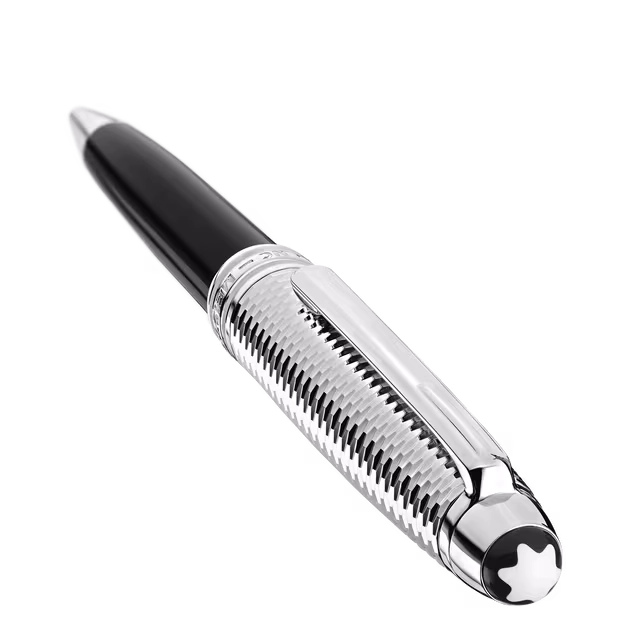 Incorpora el icónico emblema blanco de Montblanc en la parte superior, un clip platinado y tres anillos grabados con el nombre de la marca, reflejando elegancia, innovación y artesanía de alto nivel en cada detalle.
