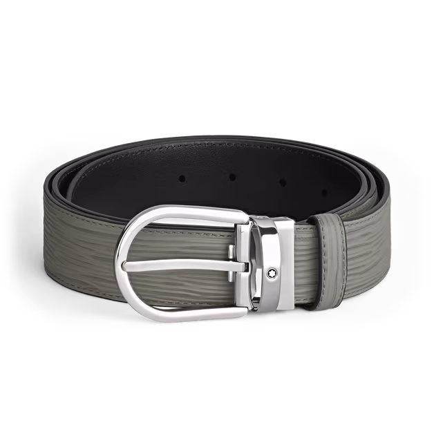 Cinturón 4810 Herradura gris medio 35 mm. Transforme cualquier conjunto en una declaración de estilo con este cinturón de 35 mm de piel gris medio adornada con un exclusivo motivo estampado de corteza de árbol y una elegante hebilla en forma de herradura con un acabado paladiado brillante.