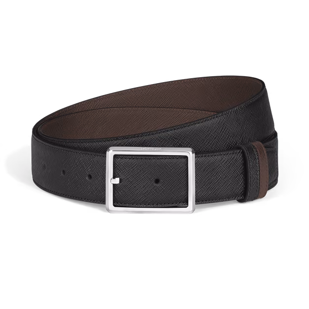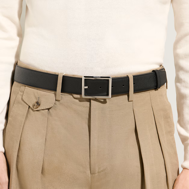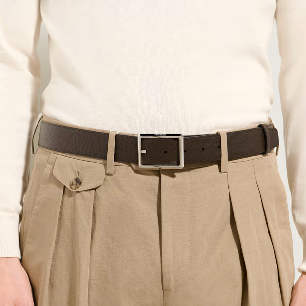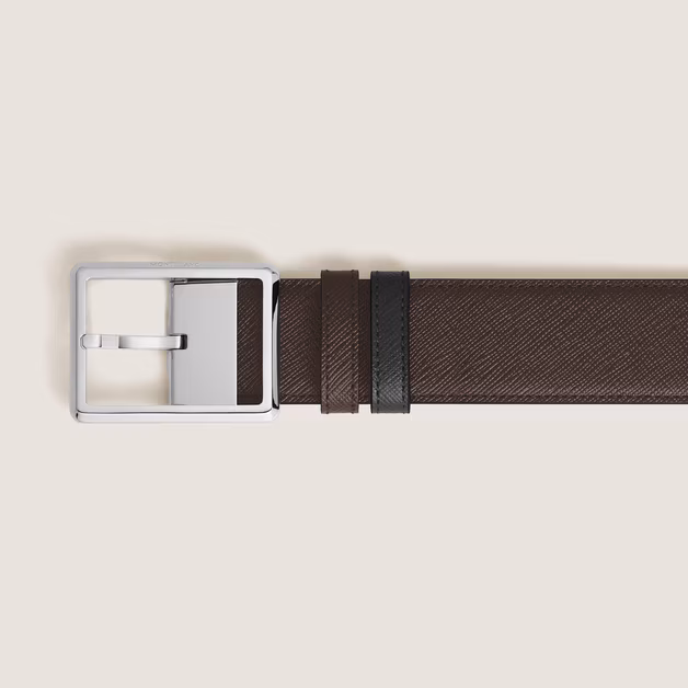 Su correa de 35 mm está elaborada en piel Sartorial repujada en ambos lados, ofreciendo dos estilos distintos en un solo accesorio: un lado en negro clásico y el otro en un sofisticado tono ébano.
