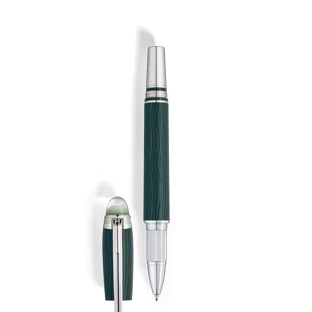 La cúpula de la parte superior del capuchón está elaborada en resina transparente y brilla bajo la luz, evocando la cautivadora danza de las auroras en el cielo nocturno. El motivo ondulado en la resina preciosa verde oscuro del capuchón y el depósito captura el brillo espectral de las luces, y el acabado mate acentúa los reflejos. Para un toque de color final, el fineliner se adorna con detalles con acabado platinado.