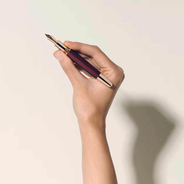 Este motivo geométrico se repite en el plumín artesanal de oro de 18 K, así como en el depósito y el capuchón, capturando la refracción de la luz al caer la tarde en la ciudad.
