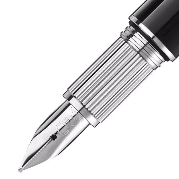 La pluma M StarWalker Resina Negro Referencia 132533 luce detalles platinados y depósito y capuchón de resina preciosa negra. La pluma estilográfica elaborada a mano tiene un plumín de oro 585 de 14 K rodiado.